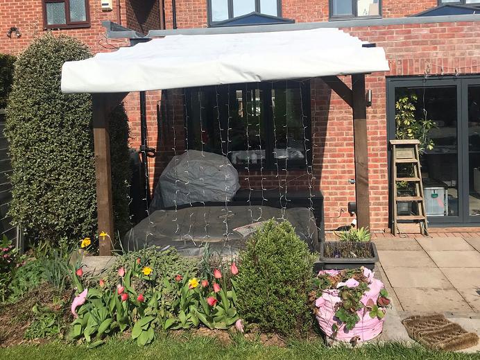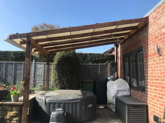 Example of a large project: Bespoke large wood shelter using handmade frame and retractable shade from waterproof material.